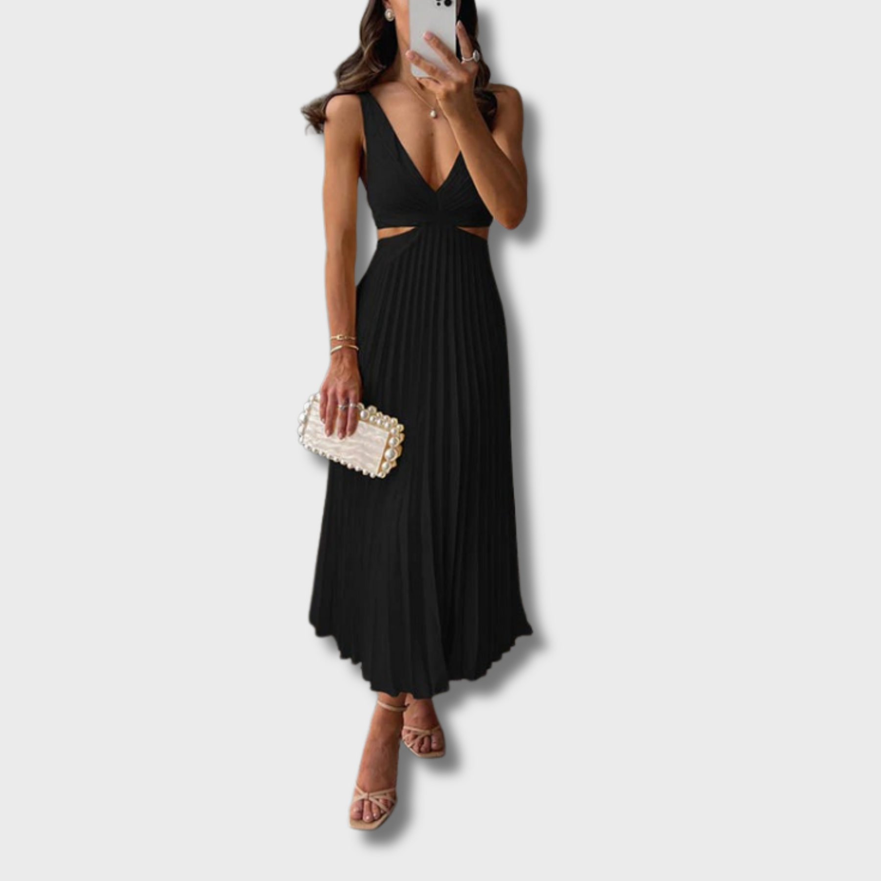 Step into sophistication with the Stella sleeveless maxi dress, featuring a flattering V-neck and pleated skirt. Designed to make you stand out at any event, this dress combines timeless elegance with a modern twist through its chic waist cut-outs.