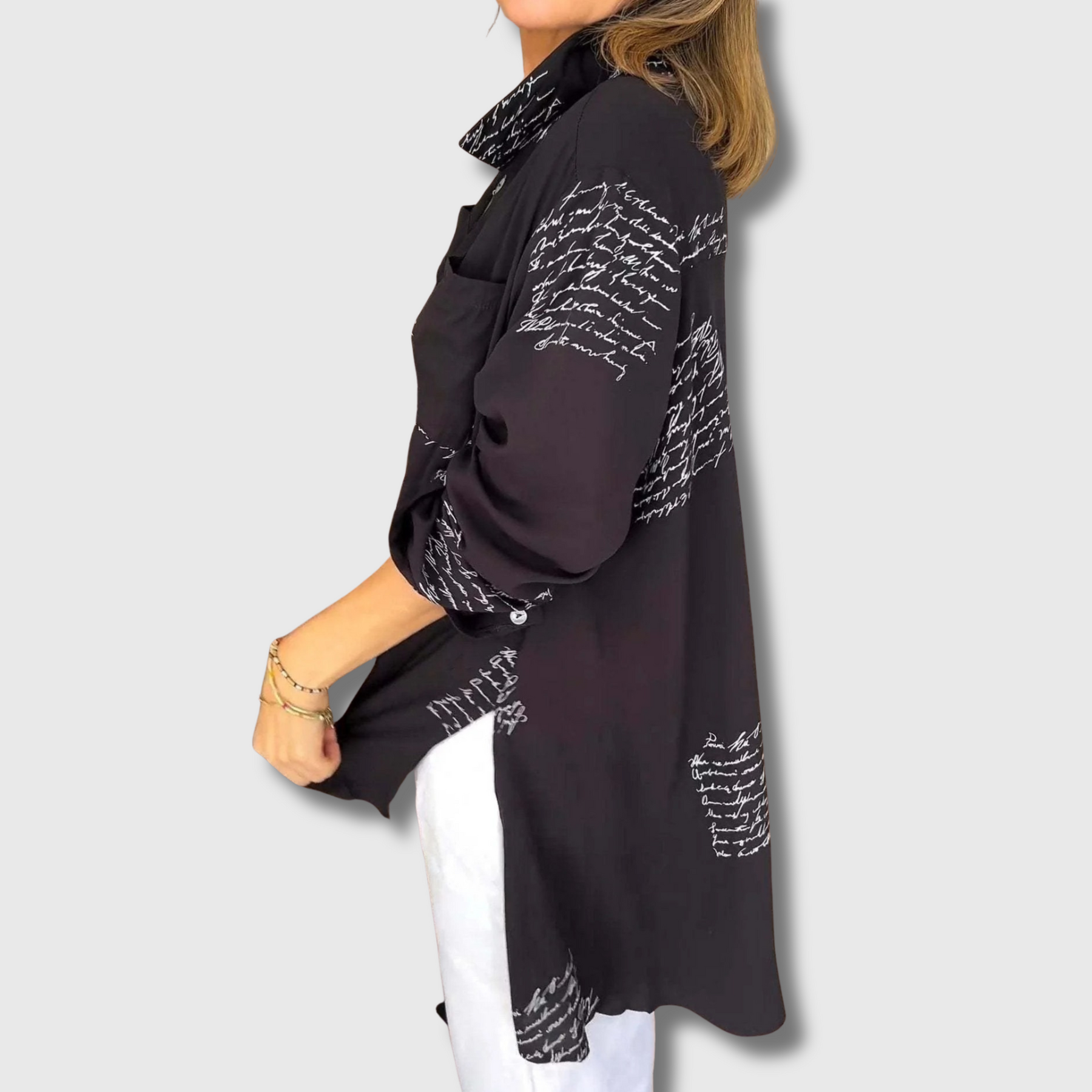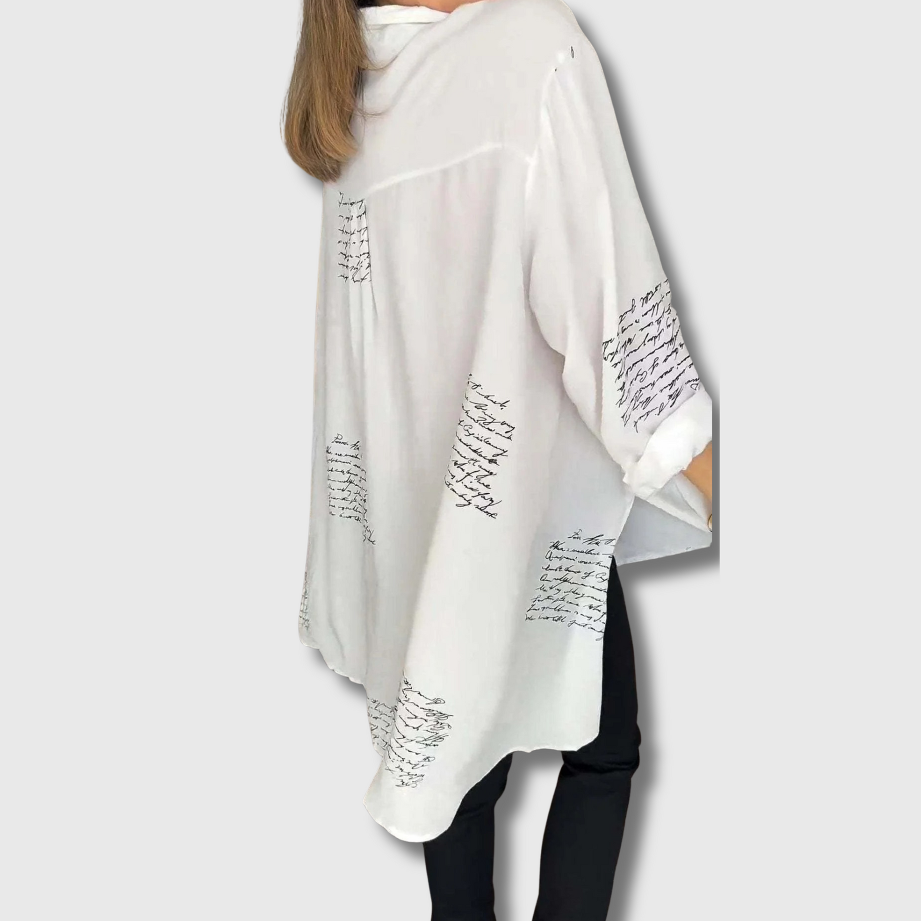 The Juane™ Handwritten Button-Up Shirt combines effortless style with an artistic twist. Perfect for both casual and smart looks, this shirt pairs well with tailored pants, jeans, or skirts, creating an elegant yet relaxed vibe.