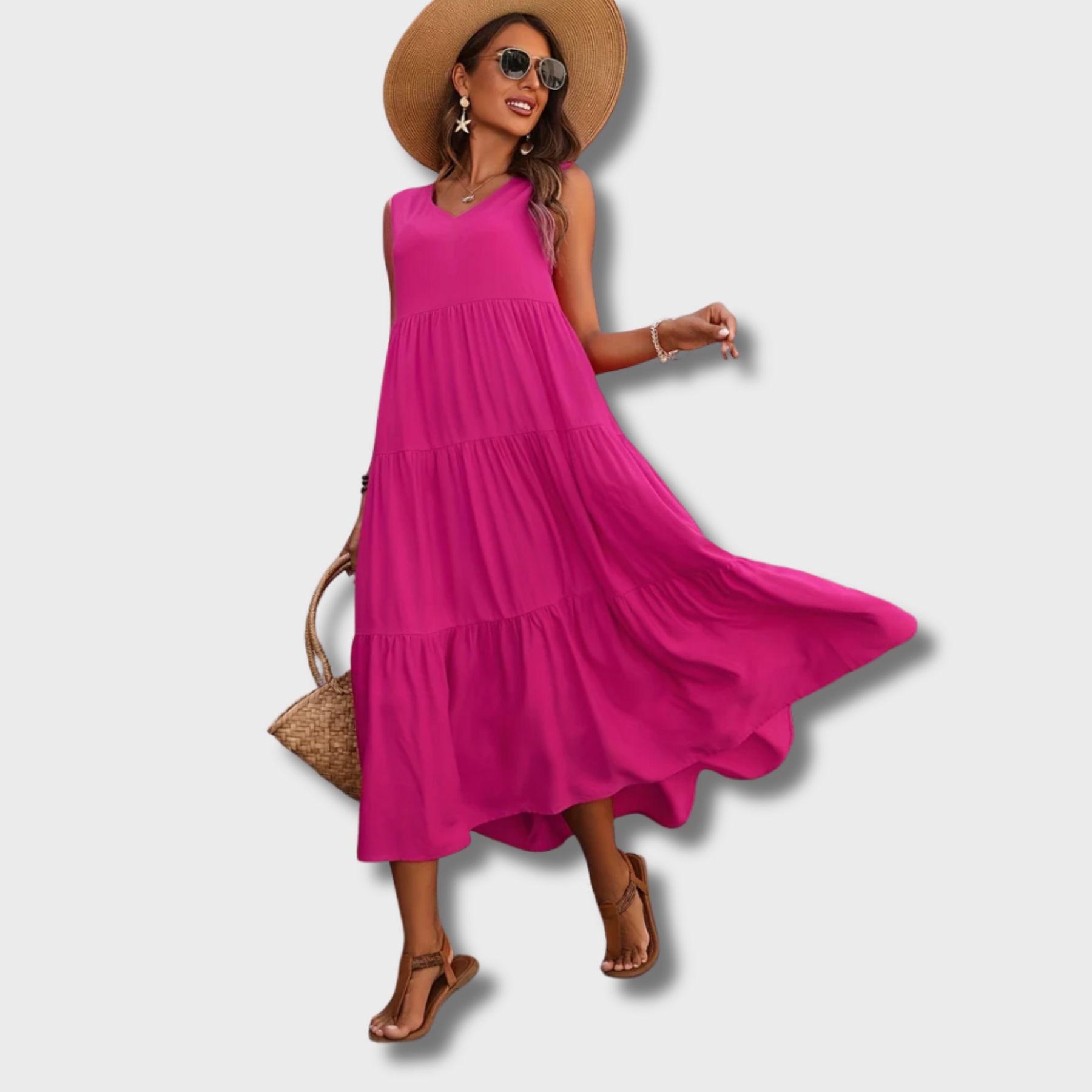 This women’s sleeveless dress is made from lightweight fabric suitable for summer use. It features a V-neckline, ankle-length hem, and a tiered silhouette. The flowing fit and relaxed shape make it appropriate for casual daytime wear and warm-weather outings.